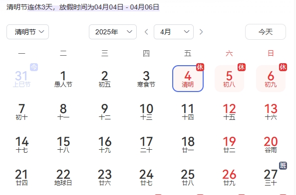 根據(jù)國家2025年春節(jié)放假通知并結(jié)合本司實際情況,放假做以下調(diào)整:1、放假時間:2025年4月4日至2025年4月6號,共3天,3月7號正常上···
